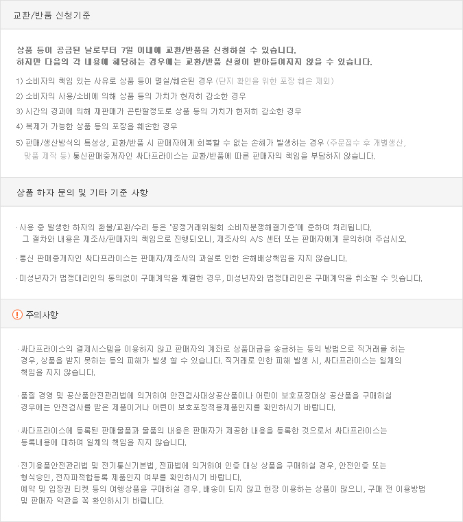 * 포장을 개봉하여 사용하거나 또는 상품의 가치가 훼손된 경우에는 반품 및 교환이 불가