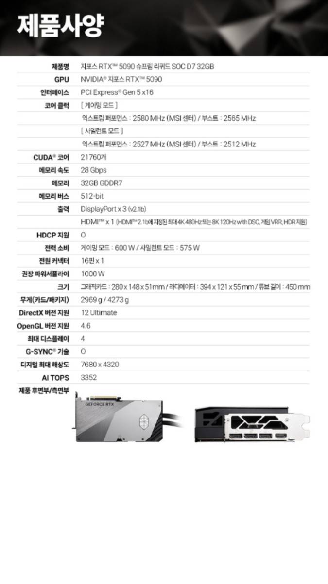 [MSI] 지포스 RTX 5090 슈프림 리퀴드 SOC D7 32GB